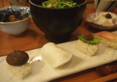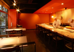人肌に保たれたシャリが口の中ではらりとほどけ、ネタの旨味を引き出す絶妙のバランスはまさに職人技。魚の形を見て、彩り良く目で見て楽しめるデザイン性のある江戸前寿司をお楽しみください。また定期的に取り寄せてつくる宍道湖産しじみの一口スープと、しじみの出しでつくる一口稲荷はオススメです。